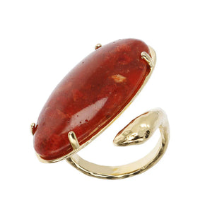 Anello contrarié Etrusca Gioielli realizzato in lega Golden, placcata oro giallo 18kt, con superficie martellata e pietra naturale (corallo bambù o turchese) dalla forma ovale allungata.