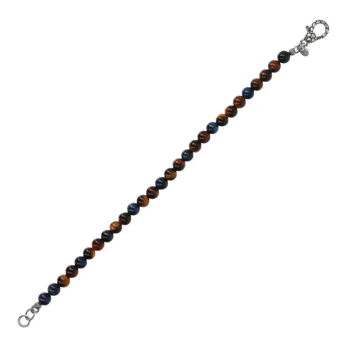 Bracciale uomo Albert M. realizzato in argento 925 con sfere (6 mm) in pietra naturale multicolore; chiusura a moschettone con texture sirena ed extender.