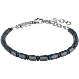 Bracciale in ematite satinata con elementi in acciaio pvd blue satinato e con chiusura a moschettone.